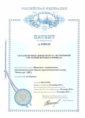 В 2014 году получен патент на новый тип буровой вышки «Складная модульная мачта с встроенной системой верхнего привода».