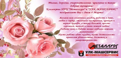 Коллектив компаний НПЦ "Металлург" и УЛК-МАШСЕРВИС поздравляет вас с Международным женским днем!08.03.2019